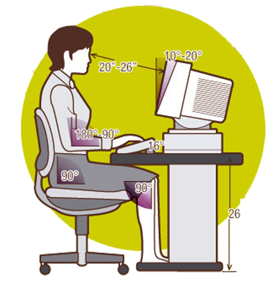 - કમ્પ્યુટર સ્ક્રીનથી ૨૦થી ૨૬ ઇંચ દૂર બેસો. સ્ક્રીનનું કેન્દ્ર તમારી આંખોના લેવલ કરતાં ૪-૬ ઇંચ જેટલું નીચું હોવું જોઈએ.