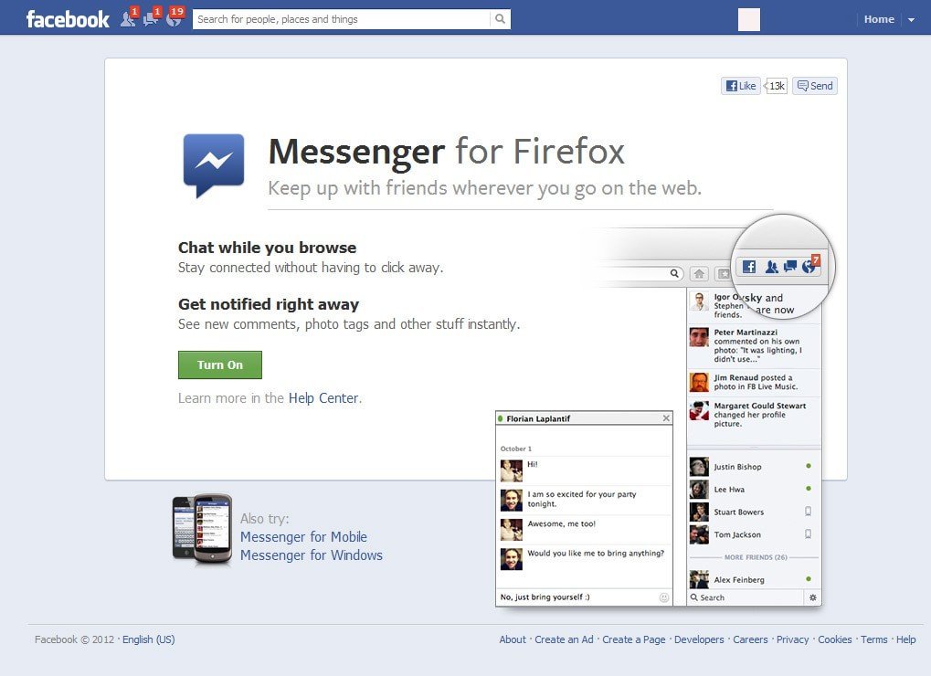 ફાયરફોક્સના ૧૭મા વર્ઝનથી આ સુવિધા ઉમેરાઈ છે એટલે તમારું બ્રાઉઝર અપડેટ કરવાની કદાચ જરૂર પડશે. એ પછી http://www.facebook.com/about/messenger-for-firefox પેજ પર જાઓ અને ફાયરફોક્સ માટે ફેસબુકની મેસેન્જર સુવિધા ઓન કરી દો. પરિણામે તમારા ફાયરફોક્સ બ્રાઉઝરમાં જમણી તરફ ઉપર ફેસબુકના નોટિફિકેશન્સનાં બટન્સ ઉમેરાઈ જશે. ફેસબુકમાં લોગ-ઇન હશો ત્યારે અહીં ફાયરફોક્સના બટનની મદદથી શો સાઇડબારનો વિકલ્પ ઓન કરશો તો ફાયરફોક્સમાં જમણી તરફ તમારા ફેસબુક મિત્રોના સ્ટેટસ સહિત મેસેન્જરની સુવિધા શરૂ થઈ જશે. ઉપરનાં બટન્સમાં તમને આવેલાં નોટિફિકેશન્સ (સંખ્યા સહિત), મેસેજીસ, ફ્રેન્ડ રિક્વેસ્ટ વગેરે પણ જોઈ શકાશે અને તેના પર એક્શન લઈ શકાશે – ફેસબુકમાં ગયા વિના!