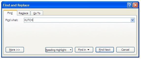 હવે ‘ફાઇન્ડ વ્હોટ’ બોક્સમાં કર્સર મૂકી, કચ્છનો સ્પેલિંગ લખો અને નીચે આપેલા ફોર્મેટના બટન પર ક્લિક કરી, તેમાં જે ફોર્મેટિંગ સાથેનો કચ્છ શબ્દ શોધવાનો છે તે ફોર્મેટિંગ સેટ કરો. એ જ રીતે, ‘રીપ્લેસ વિથ’માં કચ્છનો નવો શબ્દ અને તેનું નવું ફોર્મેટિંગ જણાવો પછી ફાઇન્ડ-રીપ્લેસ કરી લો!
