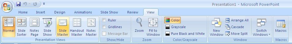 સ્લાઇડ માસ્ટર સમજવા માટે View ટેબમાં જઈને Master View > Slide Master માં જાઓ.
