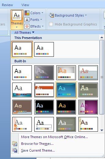 ટોચ પરની રીબનમાં નજર ફેરવશો તો તેમાં થીમ સિલેક્ટ કરવાનો એક વિકલ્પ દેખાશે. તેના પર ક્લિક કરી, વિવિધ રેડીમેઇડ થીમ તપાસી જુઓ. પ્રેઝન્ટેશનના વિષય અનુસાર સમગ્ર પ્રેઝન્ટેશન માટે જે કંઈક અંશે યોગ્ય લાગે એવી થીમ પસંદ કરો. થીમની બાજુમાં સમગ્ર પ્રેઝન્ટેશન માટે વિવિધ કલર સ્કીમ, ફોન્ટ સેટ્સ, ઇફેક્ટ્સ વગેરે પણ આપેલ છે.