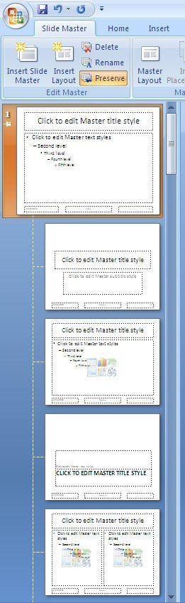 ડાબી તરફ જે સ્લાઇડ્સ દેખાય છે તેમાં સૌથી ટોચે રહેલી સ્લાઇડ મેઇન માસ્ટર સ્લાઇડ છે. તેના પછી જુદા જુદા પ્રકારનું કન્ટેન્ટ ધરાવતી સ્લાઇડ્સની અલગ અલગ માસ્ટર સ્લાઇડ્સ છે. જોકે આપણે ફક્ત પહેલી માસ્ટર સ્લાઇડમાં જરુરી ફોર્મેટિંગ કરીને કામ ચલાવી શકીએ છીએ.