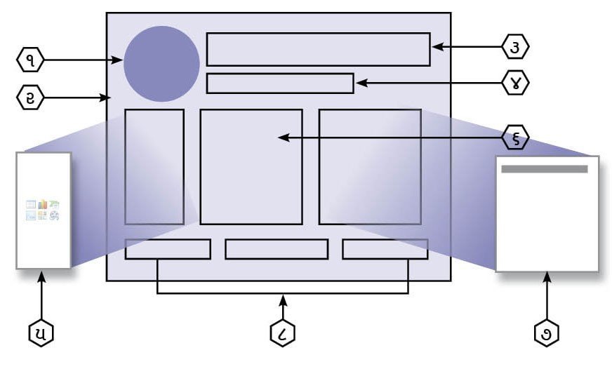 ૧. લોગો મૂકવાની જગ્યા, ૨. સમગ્ર સ્લાઇડનું બેકગ્રાઉન્ડ, ૩. શીર્ષક, ૪. પેટા શીર્ષક, ૫, ૬ અને ૭ સ્લાઇડમાં મુખ્ય લખાણ, ચાર્ટ, ટેબલ વગેરે મૂકવાની જગ્યા તથા ૮. આખા પ્રેઝન્ટેશનનું શીર્ષક, તારીખ, સ્લાઇડ નંબર વગેરે મૂકવાની જગ્યા