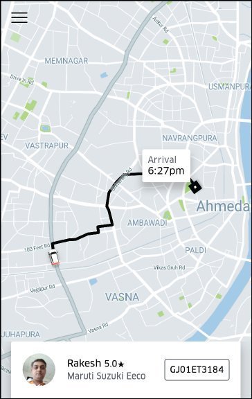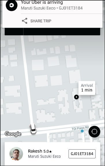 - આપણે બહાર જઈને ઊભા રહીએ એટલે એપના સ્ક્રીન પર પેલી કાર આપણા તરફ આવી રહેલી દેખાય. એપમાંની નજર ખસેડી રસ્તા પર નજર નાખીએ તો ખરેખર કાર આવી પહોંચી હોય!