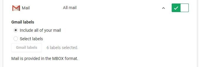 જમણી તરફની કોલમમાં તમામ સર્વિસ સામે ગ્રીન ટીકની નિશાની હશે તે દૂર કરીને ફક્ત જીમેઇલને પસંદ કરો. અહીંથી તમે જીમેઇલના તમામ મેઇલ્સને ડાઉનલોડ કરી શકો છો અથવા જો તમે લેબલ્સનો ઉપયોગ કરતા હો તો માત્ર અમુક લેબલ્સવાળા ઇમેઇલ્સ પણ ડાઉનલોડ કરી શકો છો.