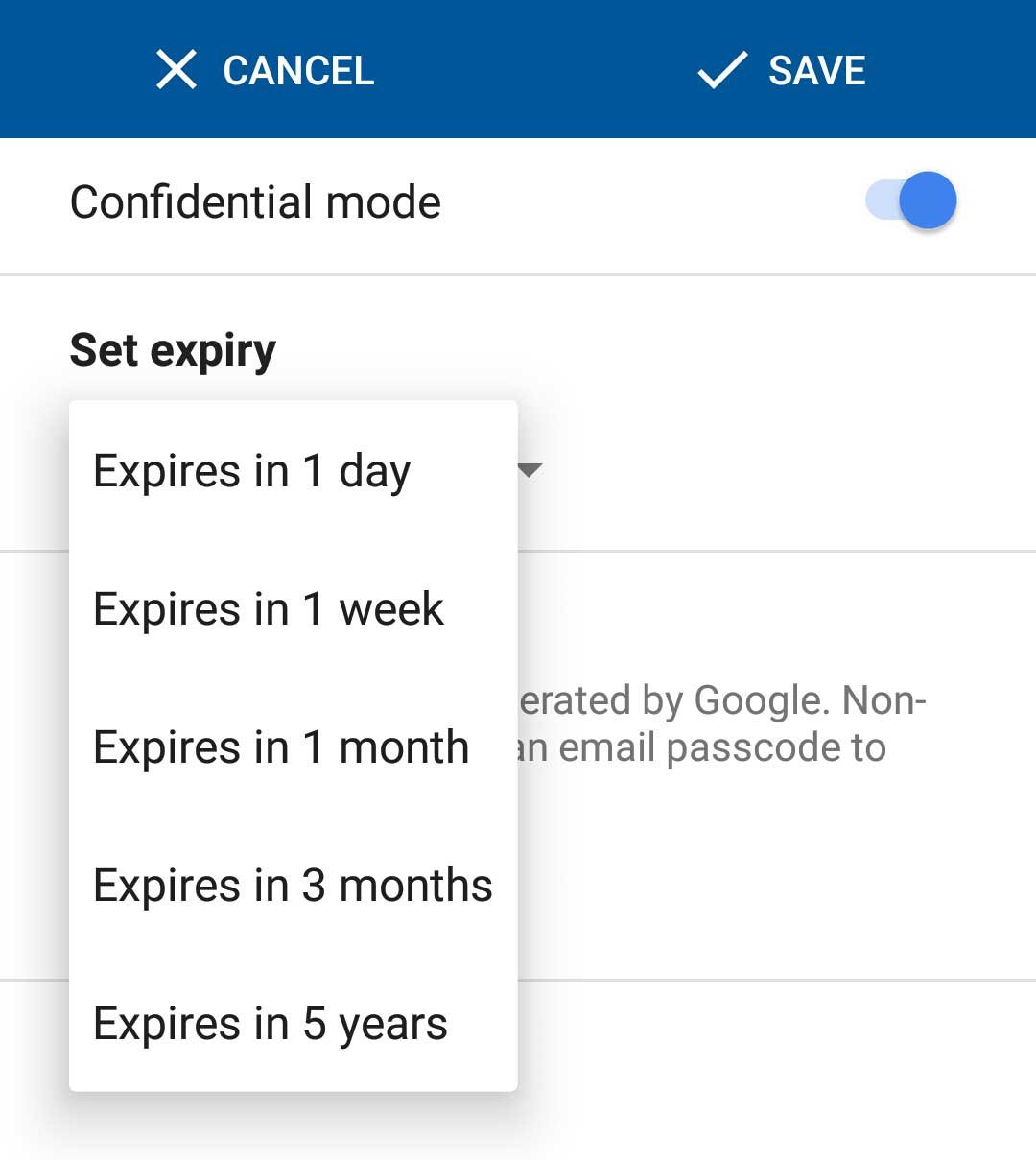 હવે તમને ઇમેઇલ ક્યારે એક્સપાયર થાય તે પસંદ કરવાના વિકલ્પ મળશે. આપણે એક દિવસ, એક અઠવાડિયું, એક મહિનો, ત્રણ મહિના અને પાંચ વર્ષના વિકલ્પોમાંથી કોઈ એક પસંદ કરી શકીએ છીએ.