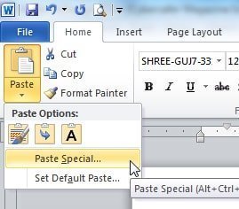 - તેમાં મથાળાની રીબનમાં હોમ ટેબમાં પેસ્ટ માટેનું ડ્રોપડાઉન મેનુ ઓપન કરો અને તેમાં ‘પેસ્ટ સ્પેશિયલ’ સિલેક્ટ કરો.