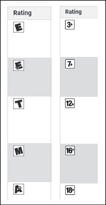 યુરોપ અને મિડલ ઇસ્ટના દેશોમાં પાન યુરોપિયન ગેમ ઇન્ફર્મેશન, ટીઇજીઆઇ દ્વારા રેટિંગ જાળવવામાં આવે છે. એ કારણે તેના દ્વારા અપાયેલા રેટિંગમાં ટીઇજીઆઈ અને ત્યાર પછી ઉંમર મર્યાદા દર્શાવવામાં આવે છે. આ સિવાય જર્મની, ઓસ્ટ્રેલિયા બ્રાઝિલ અને દક્ષિણ કોરિયા પણ પોતપોતાની રીતે રેટિંગ જાળવે છે. ભારત સહિતના અન્ય દેશોમાં આઇએઆરસીએ નક્કી કરેલાં રેટિંગ બતાવવામાં આવે છે. જેમાં જે તે એપ માટે સીધી જ ઉંમર અને ત્યાર પછી +ની નિશાની મૂકીને જે તે એપ કેટલી ઉંમરથી વધુના લોકો માટે યોગ્ય છે તે દર્શાવવામાં આવે છે.