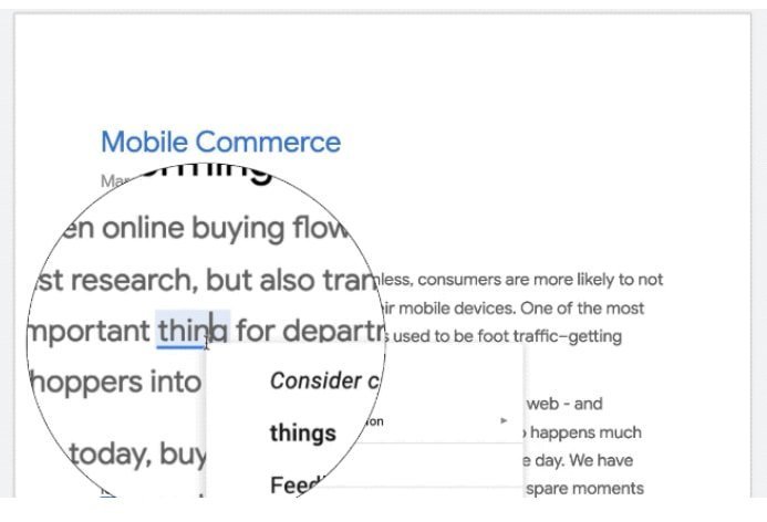 હવે તમે ગૂગલ ડ્રાઇવમાં ડોક્સમાં, ઇંગ્લિશમાં કોઈ લખાણ લખશો ત્યારે સિસ્ટમ આપોઆપ તેમાં વ્યાકરણને લગતી ભૂલો પકડીને તેને સુધારવાના વિકલ્પો સૂચવશે.