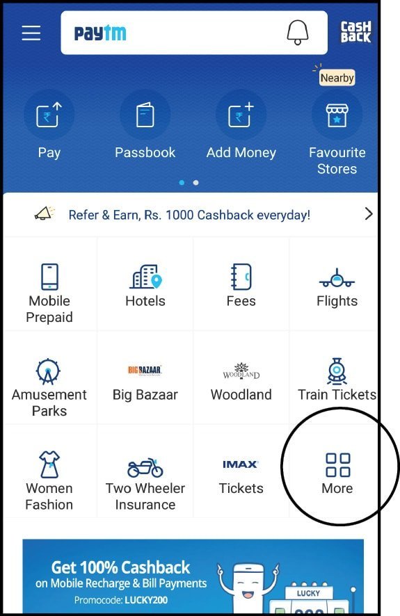 વીમા પ્રીમિયમ ભરવા પેટીએમ એપના હોમ સ્ક્રીન પર ‘મોર’ પર ક્લિક કરો.