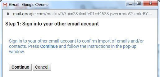 આથી એક વિન્ડો ઓપન થશે. તેમાં તમે જે અન્ય સર્વિસમાંથી મેઇલ્સ ટ્રાન્સફર કરવા માગતા હો તે એકાઉન્ટનું એડ્રેસ લખો (જેમ કે xyz@yahoo.com). હવે ‘કન્ટીન્યૂ’ બટન ક્લિક કરો.- હવે આપણને એ અન્ય મેલ સર્વિસમાં સાઇન-ઇન થવાનું કહેવામાં આવશે.