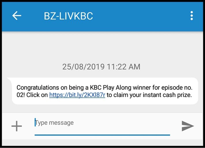 વિજેતાને BZ-LIVKBC તરફથી એક એસએમએસ મળે છે, જેમાં તમે કેબીસી પ્લે એલોંગના વિજેતા હોવાનું કહી, ઇન્સ્ટન્ટ કેશ પ્રાઇઝ મેળવવા માટે એક વેબપેજની લિંક આપવામાં આવે છે.- જો તમે કેબીસી પ્લે એલોંગમાં ભાગ ન લીધો હોય છતાં, આવી લિંક મળી હોય તો પૂરી શક્યતા છે કે એ લિંક જોખમી હોય અને તમારી વિગતો ચોરવા માટે કે કોઈક રીતે તમારા મોબાઇલમાંથી રકમ ચોરવાનો તેમાં ઇરાદો હોય.