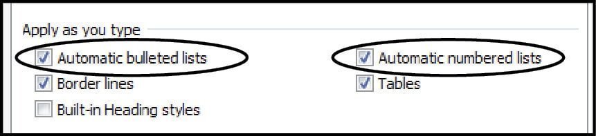 અમુક સંજોગમાં આપણને આ સ્માર્ટ સુવિધા નડતરરૂપ બનતી હોય તો વર્ડના ‘ઓપ્શન્સ’માં ‘પ્રૂફિંગ’માં ઓટો ‘કરેક્ટ ઓપ્શન્સ’માં ‘ઓટો ફોર્મેટ એઝ યુ ટેબ’માં ‘ઓટોમેટિક બુલેટેડ લિસ્ટ’ અને ‘ઓટોમેટિક નંબર્ડ’ના બોક્સમાંના ટિક દૂર કરી દો.