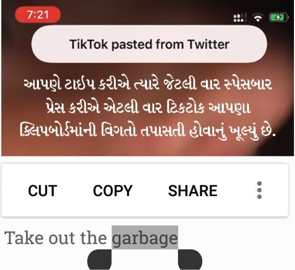 ટવીટર પર એક નાનો વીડિયો પણ વાઇરલ થયો, જેમાં આઇફોનમાં એક નાનો અમથો મેસેજ ટાઇપ કરતી વખતે, જેટલી વાર સ્પેસ બાર પ્રેસ કરવામાં આવ્યો એટલી વાર એ આઇફોનમાંની ટિકટોક એપ ક્લિપબોર્ડ પર નજર નાખતી હોવાનાં નોટિફિકેશન્સ દેખાતાં હતાં! આ વાત વધુ ચોંકાવનારી છે કેમ કે માર્ચમાં થયેલા સંશોધન વખતે જણાયું હતું કે જ્યારે કોઈ એપ ઓપન કરવામાં ફક્ત ત્યારે જ તે ક્લિપબોર્ડમાંની બાબત પર નજર નાખતી હતી. પરંતુ હવે બહાર આવ્યા મુજબ, ટિકટોક જેવી એપ તો લગભગ દર સેકન્ડે ક્લિપબોર્ડમાં નવું શું આવ્યું તે જુએ છે!