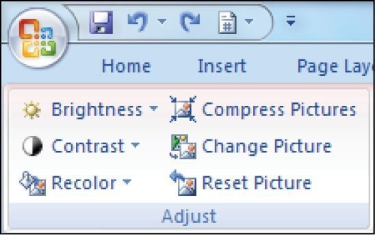 - એડજસ્ટ : આ વિભાગમાં આપણે ઇમેજની બ્રાઇટનેસ, કોન્ટ્રાસ્ટ, તેને રીકલર કરવી, તેની સાઇઝ ઘટાડવી ઇન્સર્ટ કરેલા પિકચરને બદલે બીજું કોઈ પિકચર મૂકવું કે પિકચરને તેના મૂળ સ્વરૂપમાં લાવવા રીસેટ કરવું વગેરે સુવિધાઓનો લાભ લઈ શકાય છે.