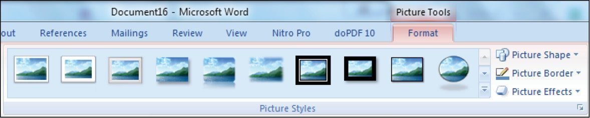 - પિકચર્સ સ્ટાઇલ્સ : અહીં આપણને પોતાની ઇમેજને જુદી જુદી રીતે સજાવવાના વિકલ્પો મળે છે. બધું જ વિઝ્યુઅલ સ્વરૂપમાં ઉપલબ્ધ હોવાથી આપણે માત્ર જુદા જુદા વિકલ્પો ક્લિક કરવાના રહે છે. એ ઉપરાંત અહીં પિક્ચરની ફ્રેમ માટે વિવિધ શેપ નક્કી કરવા, પિકચરની બોર્ડર માટે આઉટલાઇન કેટલી જાડી રાખવી, કેવા પ્રકારની રાખવી, કેવા રંગની રાખવી વગેરે નક્કી કરી શકાય છે. તેમજ પિકચરને વિવિધ રીતે શેડો આપવાના વિકલ્પો પણ અહીં મળે છે.