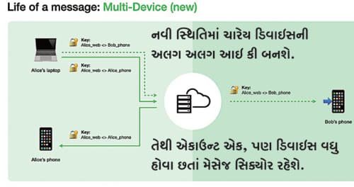હવે નવી સ્થિતિમાં વોટ્સએપના એક એકાઉન્ટનો જે અન્ય ડિવાઇસ પર ઉપયોગ કરવામાં આવશે તે દરેકની આગવી આઇડેન્ટિટી કી જનરેટ થશે અને તે આપણા મૂળ વોટ્સએપ એકાઉન્ટ સાથે કનેક્ટ કરવામાં આવશે. હવે આપણે જે ડિવાઇસ પરથી મેસેજ મોકલીએ એ ડિવાઇસની આઇડેન્ટિટિ કી અને એન્ક્રિપ્શન કીનો ઉપયોગ કરીને મેસેજને સિક્યોર કરવામાં આવશે. આ કારણે વોટ્સએપનો આપણો ડેટા હવે એકથી વધુ ડિવાઇસમાં સ્ટોર થશે, છતાં સિક્યોર રહેશે. બદઇરાદો ધરાવતી કોઈ વ્યક્તિ અન્ય યૂઝરના વોટ્સએપ એકાઉન્ટને પોતાના ડિવાઇસમાં મૂળ યૂઝરની મંજૂરી વિના એક્ટિવેટ ન કરી શકે એવી પણ કાળજી રાખવામાં આવી છે. જુદા જુદા ડિવાઇસમાં આપણે પોતાના વોટ્સએપ એકાઉન્ટનું વારંવાર વેરિફિકેશન ન કરવું પડે એ માટે ‘ઓટોમેટિક ડિવાઇસ વેરિફિકેશન’ તરીકે ઓળખાતી ટેકનોલોજી ઉપયોગ કરવામાં આવશે.