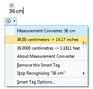 જ્યારે ડોક્યુમેન્ટમાં આપણે એક યુનિટમાંના મેઝરમેન્ટ લખીશું (કે પહેલેથી લખેલ હશે) જેમ કે ૩૬ સેમી ત્યારે એ શબ્દોને ડોટેડ અન્ડરલાઇન થશે. એનો અર્થ એ કે આ શબ્દો માટે સ્માર્ટ ટેગ કે એકશનની સગવડ ઉપલબ્ધ છે. તેના પર કર્સર લઈ જઇશું એટલે ‘આઇ’ સાથેનું ડ્રોપડાઉન મેનૂ જોવા મળશે. તેને ક્લિક કરતાં એ યુનિટના અન્ય યુનિટના વિકલ્પો જોવા મળશે. ચાહો તે પસંદ કરો અને આગળ વધો!
