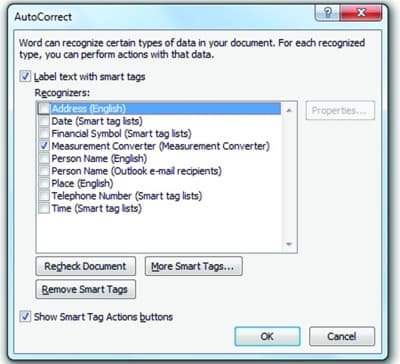 અહીં તમે જોશો તેમ એડ્રેસ, ડેટ, ફાયનાન્સિયલ સિમ્બોલ, મેઝરમેન્ટ કન્વર્ટર, પર્સન નેમ, પ્લેસ, ટેલિફોન નંબર, ટાઇમ વગેરે બાબતો વર્ડ કે પાવરપોઇન્ટની સિસ્ટમ ઓળખી લે અને તેના પર વધુ એકશનની સગવડ આપે તેવું આપણે પસંદ કરી શકીએ છીએ. હાલ પૂરતું, મેઝરમેન્ટ કન્વર્ટર માટેના બોક્સમાં ટિક કરો અને ઓકે કહી દો. ઓપ્શન્સ મેનૂમાંથી બહાર નીકળવા માટે વધુ એક વાર ઓકે કહેવાનું થશે.