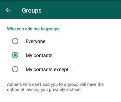 આ માટે વોટ્સએપ એપના સેટિંગ્સમાં જાઓ. તેમાં એકાઉન્ટમાં પ્રાઇવસીમાં જાઓ અને તેમાં ગ્રૂપ્સમાં માત્ર ફોનમાંના કોન્ટેક્ટ્સ તમને ગ્રૂપમાં ઉમેરી શકે એવું સેટિંગ કરવું હિતાવહ રહેશે!