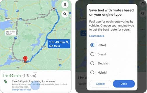 જો આપણા રૂટ પર ટોલ પ્લાઝા આવતું હોય તો તેમાં કેટલો ટોલ ટેક્સ ચૂકવવાનો થશે એ પણ ગૂગલ આપણને બતાવી શકે છે. હવે આ રૂટ ઓપ્શન્સમાં ‘ફ્યુઅલ એફિશિયન્ટ રૂટ’ પસંદ કરી શકાશે. આ માટેનો વિકલ્પ ક્લિક કર્યા પછી આપણે પોતાની કારના એન્જિનનો પ્રકાર પસંદ કરવાનો રહેશે. આ પછી આપણે કોઈ ડેસ્ટિનેશન માટે નેવિગેશન ઓન કરીશું ત્યારે ગૂગલ મેપ સર્વિસ આપણી સ્પીડ, રૂટ પરના ટ્રાફિક તથા વાહનના એન્જિનના પ્રકાર અનુસાર ક્યા રસ્તા પર ઓછામાં ઓછું ફ્યુઅલ વપરાશે તે બતાવી શકશે.
