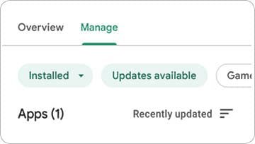 કઈ કઈ એપમાં આવા અપડેટ્સ ઉપલબ્ધ છે તે જાણવા માટે ફરી, પ્લે સ્ટોરના સેટિંગ્સમાં જાઓ. તેમાં ‘મેનેજ’ ટેબમાં અપડેટ ઉપલબ્ધ હોય તેવી એપ્સની યાદી જોવા મળશે, જો તમે ઓટોમેટિક અપડેટ્સ ઓન રાખ્યા હશે તો અપડેટ થયેલી એપ્સની યાદી મળશે. તમે મેન્યુઅલી અપડેટનું સેટિંગ રાખ્યું હોય તો અહીંથી તમે ઇચ્છો તે એપને અપડેટ કરી શકો છો.