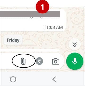 એ માટે એન્ડ્રોઇડમાં વોટ્સએપમાં મેસેજ ટાઇપ કરવાના બોક્સમાં એટેચમેન્ટના પેપર ક્લિક જેવા આઇકન પર ક્લિક કરો.