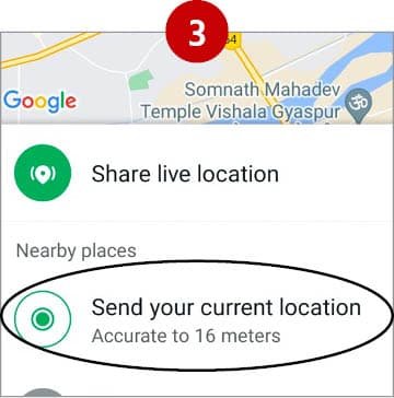 જે વિકલ્પો ખુલે તેમાં લોકેશન સિલેક્ટ કરો. હવે ‘નીયર બાય’ અથવા ‘કરંટ લોકેશન’ શેર કરવાનો વિકલ્પ મળશે.