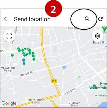 ફક્ત લોકેશન શેર કરતી વખતે સર્ચ આઇકન પર ક્લિક કરીને જે લોકેશન શેર કરવાનું હોય તેને સર્ચ કરી તેને ક્લિક કરવાનું રહેશે.