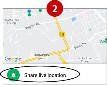 આપણે જ્યાં જ્યાં જઇએ તે સ્થળનું લાઇવ લોકેશન પણ શેર કરી શકાય. એ માટે પણ આગળ જણાવ્યા મુજબ લોકેશન શેર કરવાનું રહેશે અને ત્યારે શેર લાઇવ લોકેશનનો વિકલ્પ પસંદ કરવાનો રહેશે.