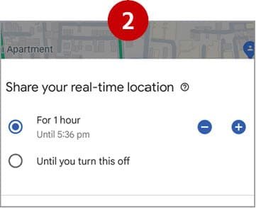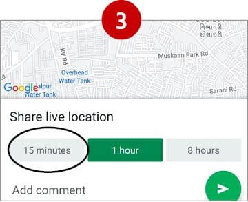 આપણે લોકેશન શેરિંગ શરૂ કરીએ ત્યારથી ૧૫ મિનિટથી લઇને આઠ કલાક સુધી લાઇવ લોકેશન શેરિંગ ચાલુ રહે તેવો વિકલ્પ પસંદ કરી શકીએ છીએ.