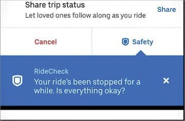 ઉબરમાં ‘રાઇડચેક’ નામે એક ફીચર ઉમેરાયું છે. તેની મદદથી કંપની દરેક ટ્રિપ ચેક કરતી રહે છે અને જો કોઈ કાર નિર્ધારિત માર્ગ કરતાં જુદો વળાંક લે કે કોઈ જગ્યાએ સામાન્ય કરતાં વધુ સમય રોકાઈ રહે તો કંપની તરફથી મુસાફરને નોટિફિકેશન મોકલી પૂછવામાં આવે છે કે બધું બરાબર છેને?
